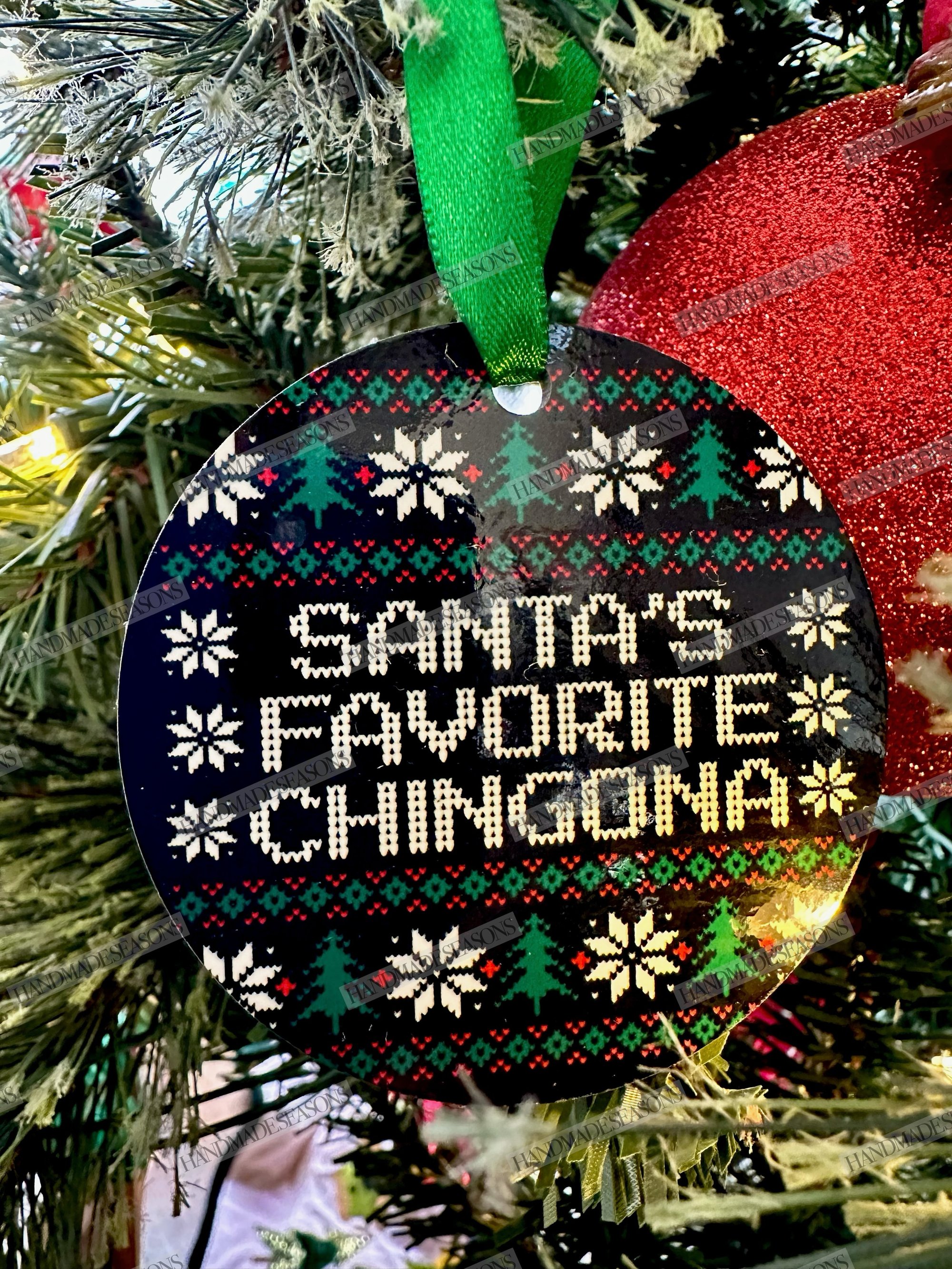 Double sided mdf ornament, measures about 2.75". Design is on both sides. Includes a coordinating ribbon for easy hanging.